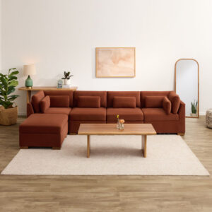 Expansive yet streamlined, our Montclair modular sectional sofa invites versatile transitional style, plush comfort, and space-saving storage into living rooms of all sizes. Upholstered with textural ivory or velvety rust fabric with matching lumbar pillows, this sectional couch includes an ottoman to arrange as an adjustable faux chaise and use as a cozy extra seat….