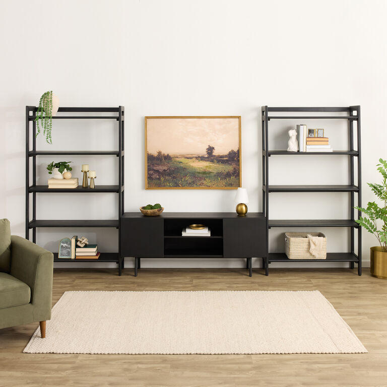 Beautifully crafted of solid acacia wood, our Dane mid-century storage furniture set presents two showcase bookshelves flanking a 60-inch media stand, creating a stylish modular entertainment wall. This versatile arrangement of open shelving and interior storage – in black or walnut finishes – fills in rooms of all sizes as a polished centerpiece for movie nights, gaming, book and decor collections, and more. A World Market value ready to transform your living room, office, or den, this 3-piece set is just one of the many ways our Dane modular storage furniture can be configured.