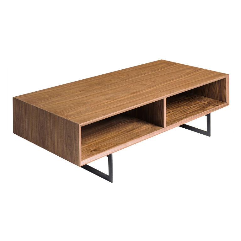 Crafted of natural walnut-toned wood, the Emilio mid-century coffee table brings streamlined storage to small spaces with spacious open shelves. Raised on steel sled legs in matte black, this rectangular living room table tucks away accessories, books, electronics and much more in two interior compartments. With essentials kept out of sight, the surface of this mixed-material coffee table is left free for entertaining in your family room.