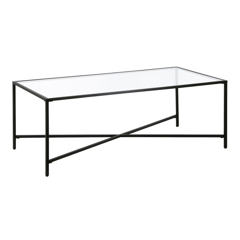 With a clean-lined, industrial-inspired silhouette, the Mille rectangular coffee table is a versatile addition to any living room. Topped with a smooth glass surface, this modern minimalist coffee table features a metal frame with crossbar detailing in your choice of blackened bronze and brass finishes.
